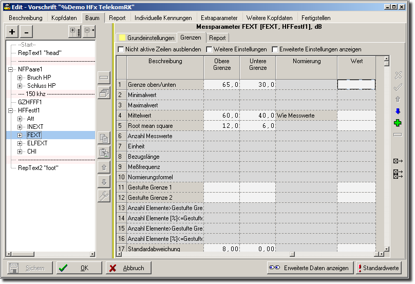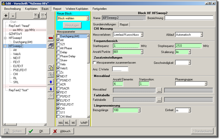 Es steht eine große Auswahl von Messarten und Auswertungen zur Verfügung. Unter anderem: HF-Sweep, HF-Sweep(Alien), HF-Koax-50, HF-Koax-75, HF-Festfrequenz, NF-Adern, NF-Paare, NF-Dreier, NF-Vierer, LCL, LCTL, TCL, TCTL, TI, AS, Grenzfall-Zusammenfassung für HF-Sweep/ NF/ HF-Festfrequenz, Induktivität und Ableitung.