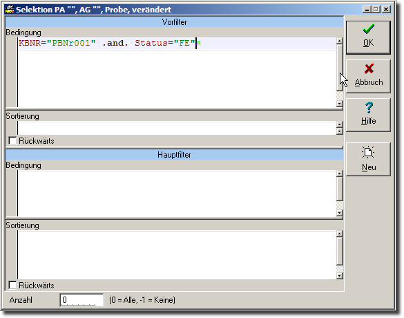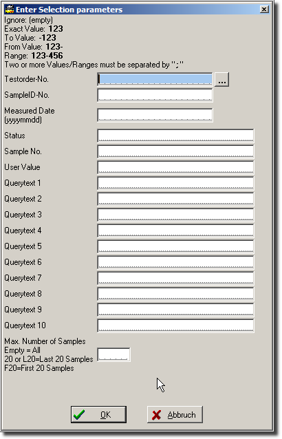 - Suchen mit vordefinierten oder vom Anwender definierten Filter (z.B. Suchen der letzten 20 Proben mit bestimmter Kabelnummer, Datum, bestimmten Merkmalen)