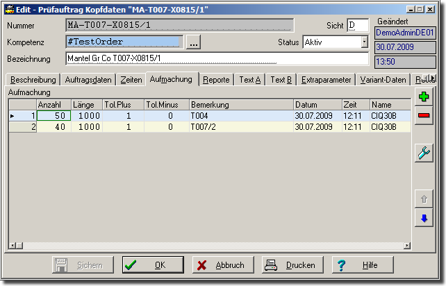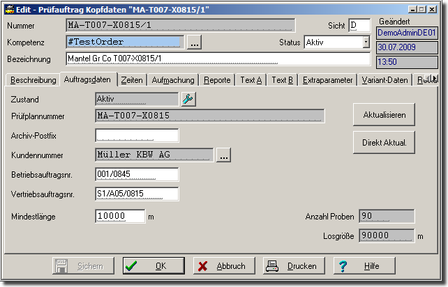 Bei der Erstellung und Bearbeitung eines Prüfauftrags können auftragsspezifische Daten eingegeben werden. Dazu gehören unter anderem spezielle Reportformate, Selektionen (Filter), Aufmachungen und zusätzliche Auftragsdaten (Variant-Daten). Letztere finden auch Verwendung bei der Aufnahme von Daten aus anderen Datenbanken oder Systemen.