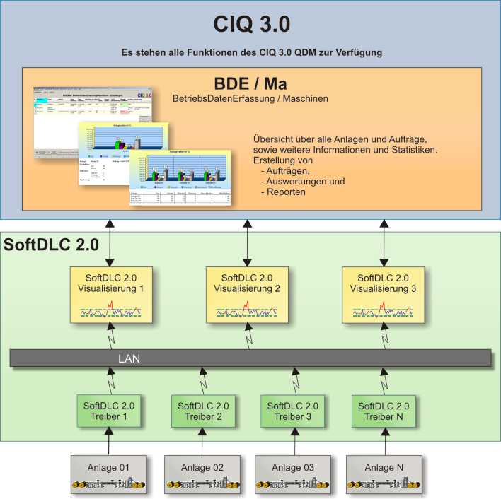 BDE/MaBetriebsdatenerfassung-Maschinen (Konzept)BDE/Ma ist eine spezielle Anwendung (Modul) im CIQ 3.0. Mit Hilfe des SoftDLC 2.0 werden Betriebs- und Produktionsdaten einzelner Produktionsanlagen erfasst und an das CIQ 3.0 weitergeleitet. Das BDE/Ma-Modul wertet diese Daten zusammen mit den im Datenbestand des CIQ 3.0 enthaltenen Auftragsdaten aus. In der zentralen Übersichtstabelle des BDE/Ma werden alle Daten dargestellt und stehen für weitere Auswertungen zur Verfügung. ![]() |