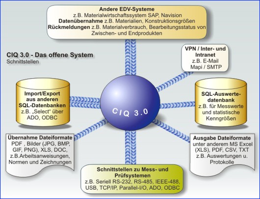 Aufgrund seiner vielfältigen Schnittstellen lässt sich das CIQ 3.0 in vorhandene EDV-Strukturen gut integrieren. Es hat eine Vielzahl von Schnittstellen: